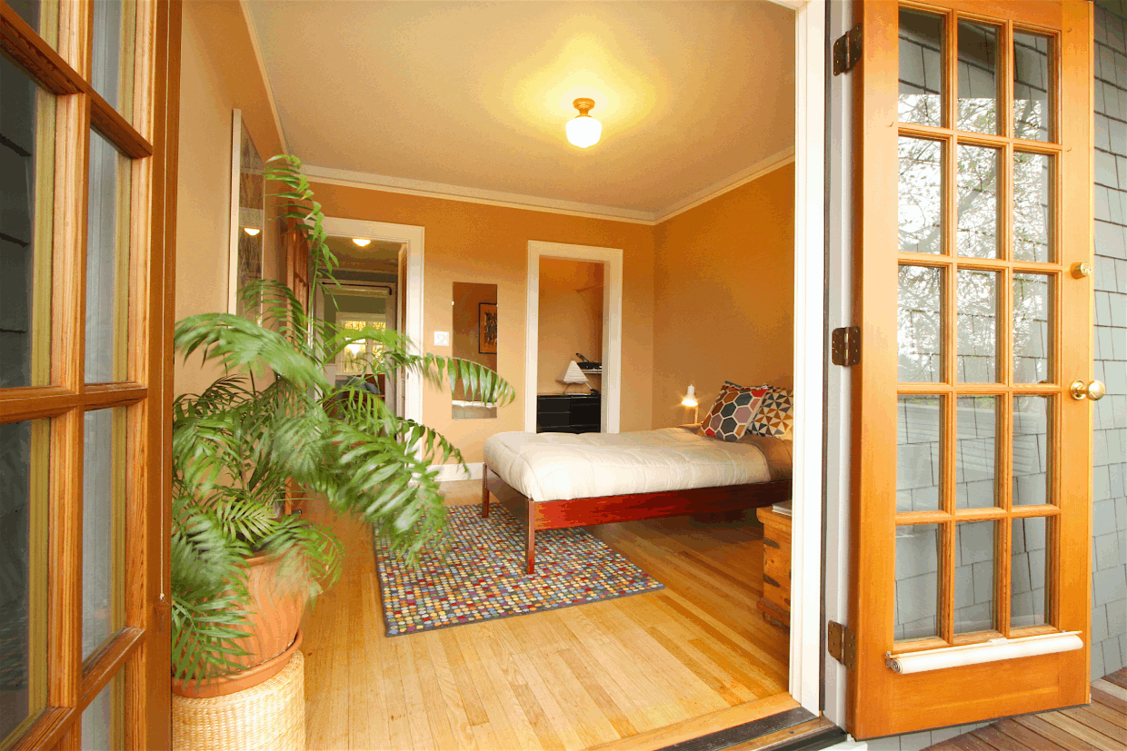Cozy is the operative word to describe this western-facing room that opens to a deck. Terra cotta walls are brightened by warm white trim—consistent throughout the home. Bolder colors can cause strong reactions, so color flow from room to room and the level of natural light is considered carefully.